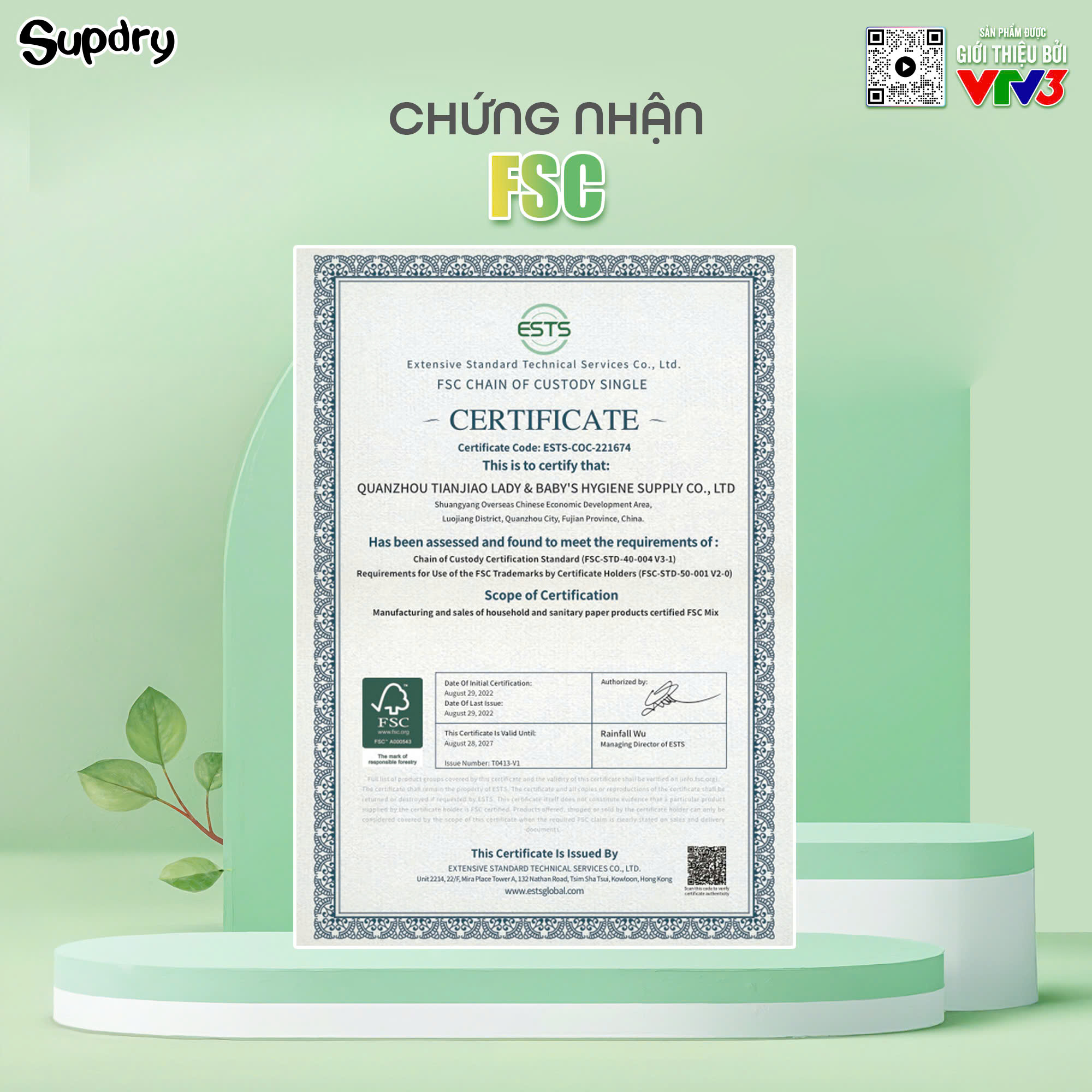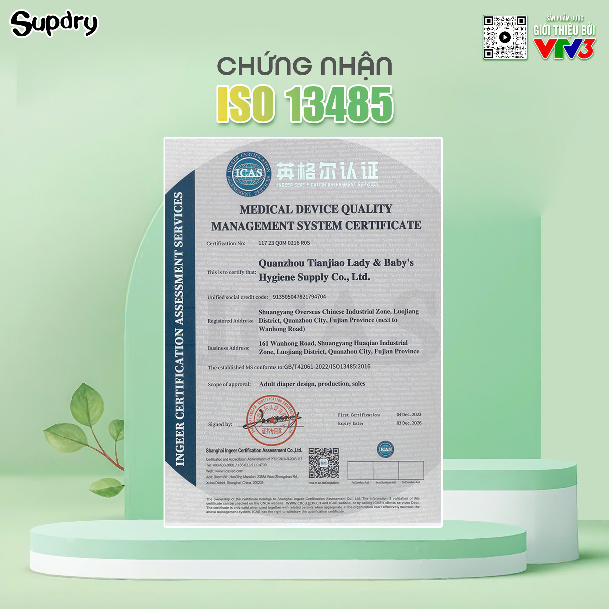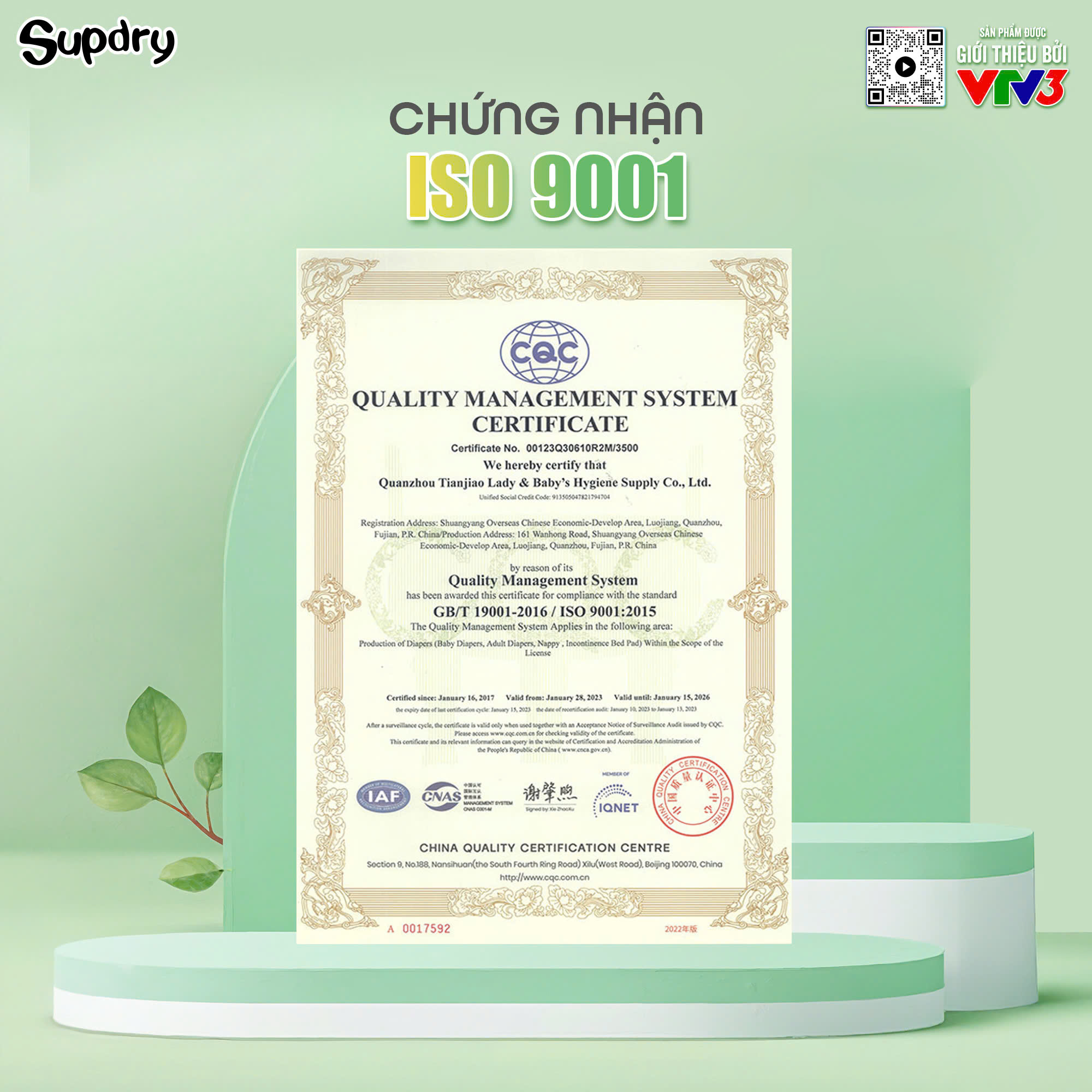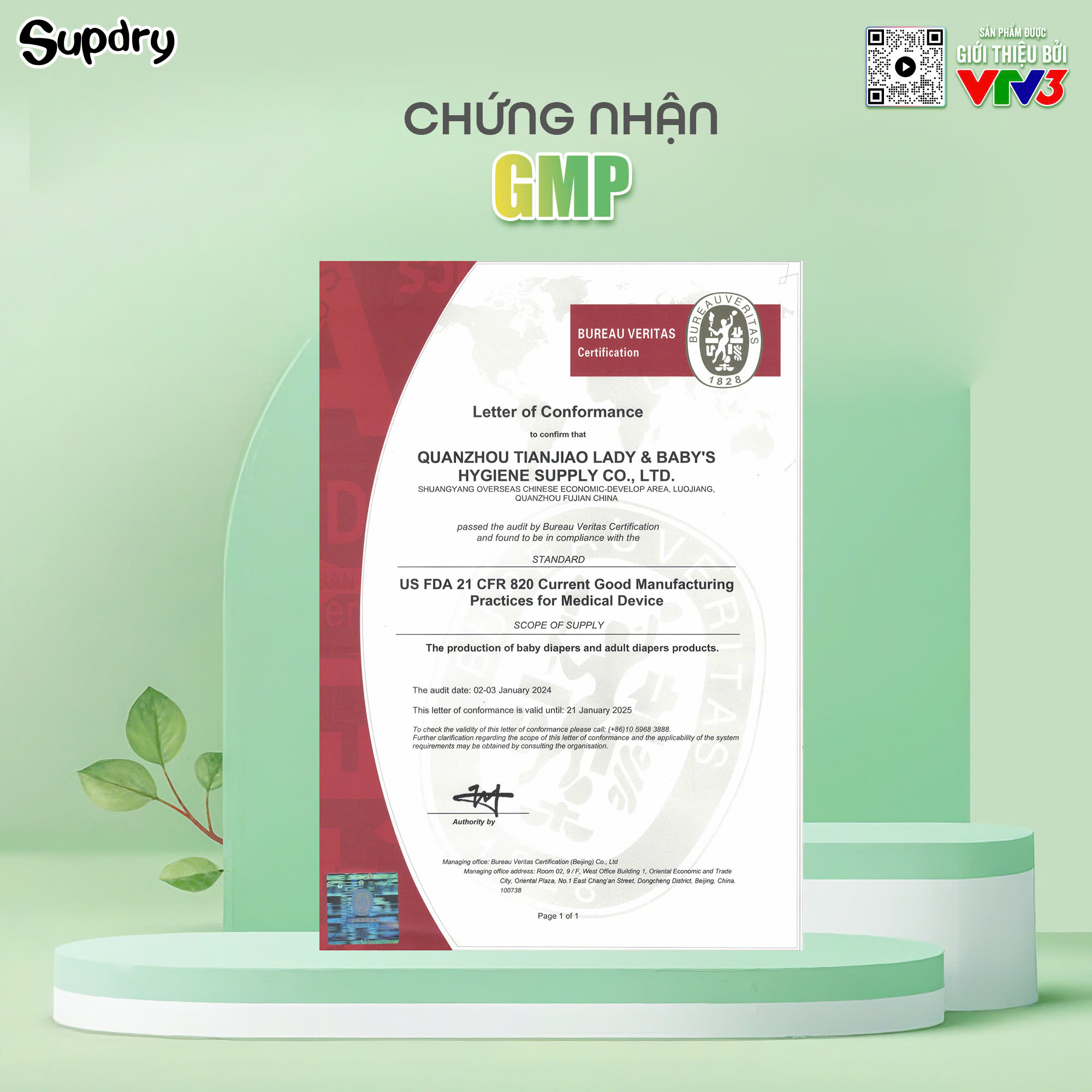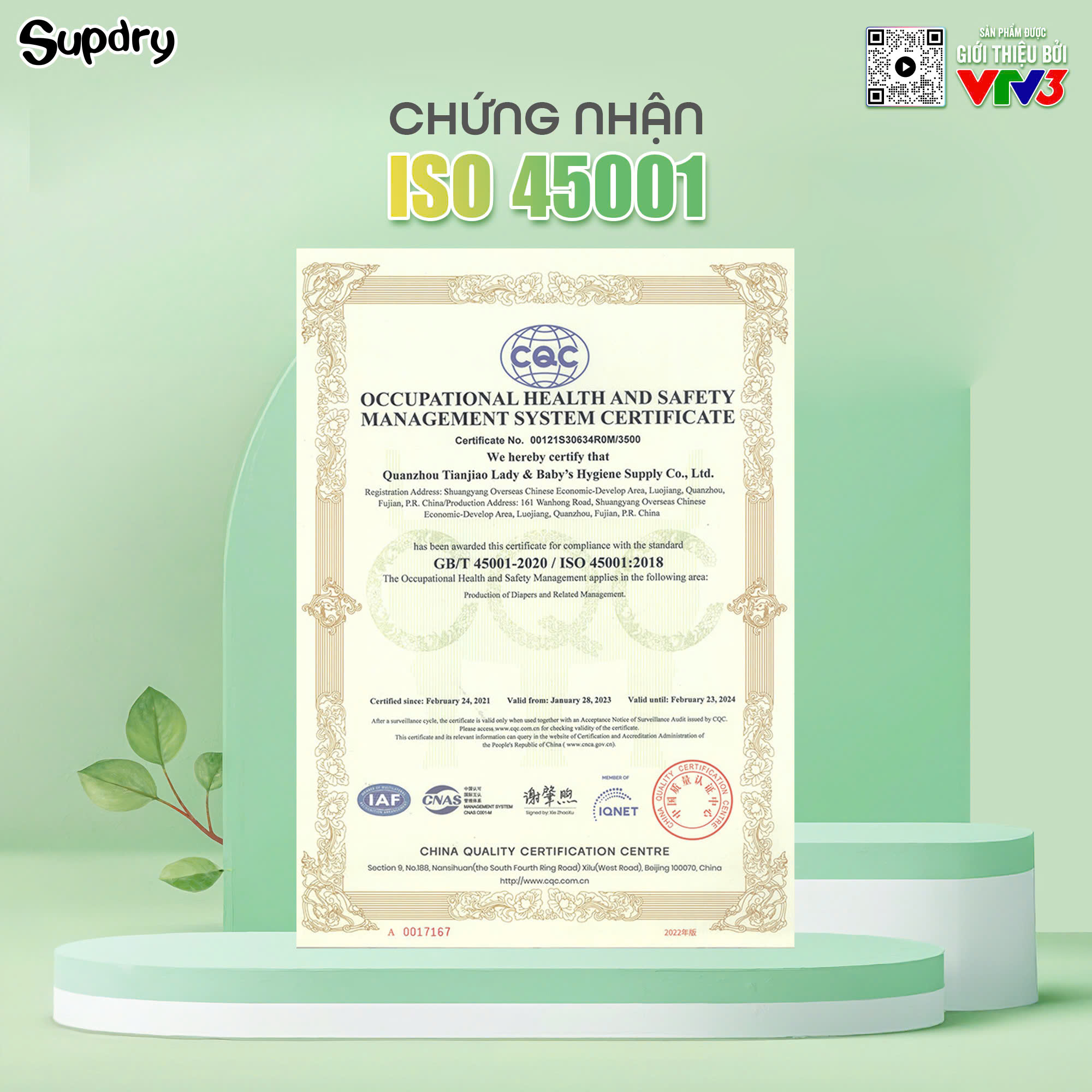 Các sản phẩm Supdry được sản xuất tại nhà máy TOP 3 thế giới trong lĩnh vực sản xuất tã bỉm và đạt hàng loạt chứng nhận quốc tế về hệ thống quản lý chất lượng và quy trình sản xuất an toàn: