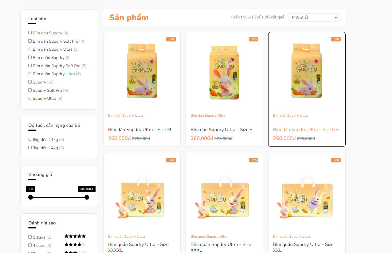 – Vào mục sản phẩm, kéo xuống dưới và tích vào bộ lọc theo các tiêu chí cần tìm kiếm